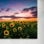 Un vasto campo di girasoli si estende all’orizzonte, illuminato dalla calda luce del tramonto. Con i loro volti rivolti verso il sole, questi fiori straordinari creano un mosaico di giallo brillante che incanta chiunque si avvicini. Il cielo, con sfumature di blu e arancio, aggiunge ulteriore magia al paesaggio. Questo luogo rappresenta non solo la bellezza della natura, ma anche la gioia che i girasoli portano nella vita quotidiana. Perfetto per una passeggiata rilassante o una sessione fotografica indimenticabile, questo campo è un angolo da non perdere per gli amanti della natura.