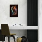 L’immagine raffigura un leone incantevole, avvolto da un’aura mistica e luminosa. Gli effetti di luce che circondano il felino creano un’atmosfera surreale, quasi eterea, facendo sembrare il leone un’apparizione fantasmagorica. L’ambientazione notturna, con alberi sfocati e sfumature di colore che si intrecciano, contribuisce a rendere questa scena magica. Il leone, simbolo di forza e regalità, si erge maestoso al centro della composizione, evocando un senso di mistero e fascino. Questo “Ghost Lion” cattura l’immaginazione, trasportando l’osservatore in un mondo dove la natura e il soprannaturale si fondono in armonia.