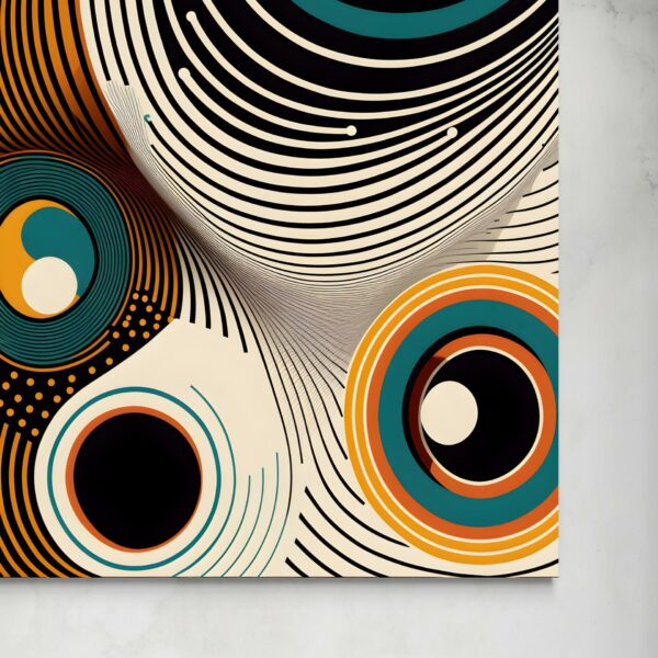 Un’illustrazione astratta che esplora temi visivi, con colori vivaci e cerchi concentrici.