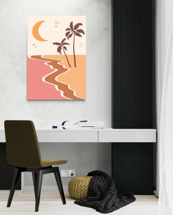 Illustrazione serena di una luna su una spiaggia con palme, ideale per decorare spazi moderni.