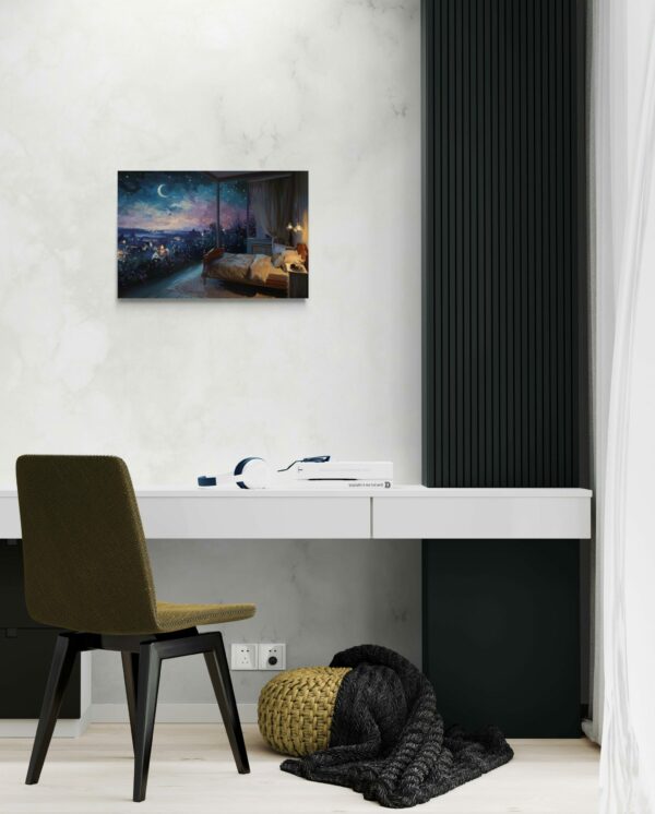 Questa immagine cattura l’incantevole vista di un borgo sotto un cielo stellato, creando un’atmosfera di tranquillità e bellezza. La scena, caratterizzata da un mix di toni blu, viola e oro, mette in risalto la luce delle case che si affacciano su un paesaggio sereno. La finestra sul lato destro incornicia il panorama, mentre l’interno della stanza, con un letto accogliente e un comodino illuminato, invita a sognare. La bellezza di un giorno che volge al termine è esaltata dalle stelle e dalla luna che brillano nel firmamento, promettendo una notte di pace e contemplazione. Questo scatto è un perfetto esempio di come la natura e l’architettura si fondano in un’unica scena armoniosa, creando un rifugio ideale per chi cerca ispirazione e relax.